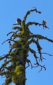 object of the chickadees’ ire…a Northern Pygmy Owl perched on a lichen covered snag. Two
