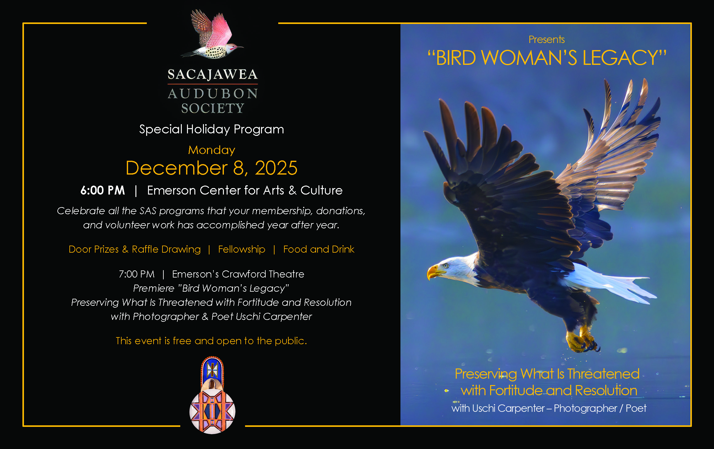 SAS monthly programs are free and open to the public, featuring a special guest speaker the 2nd Monday of each month, September through May. For more information, contact Chris Nixon at programs@sacajaweaaudubon.org.