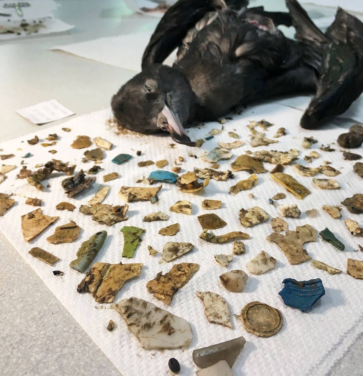 According to Cornell Ornithological Labs, at least 80 seabird species ingest plastic, mistaking it for food. By 2050, scientists estimate that 99% of seabird species will have eaten plastic. Scientists have now described a new disease for Flesh-footed Shearwaters: plasticosis. This disease is marked by severe stomach damage from eating little bits of plastic.