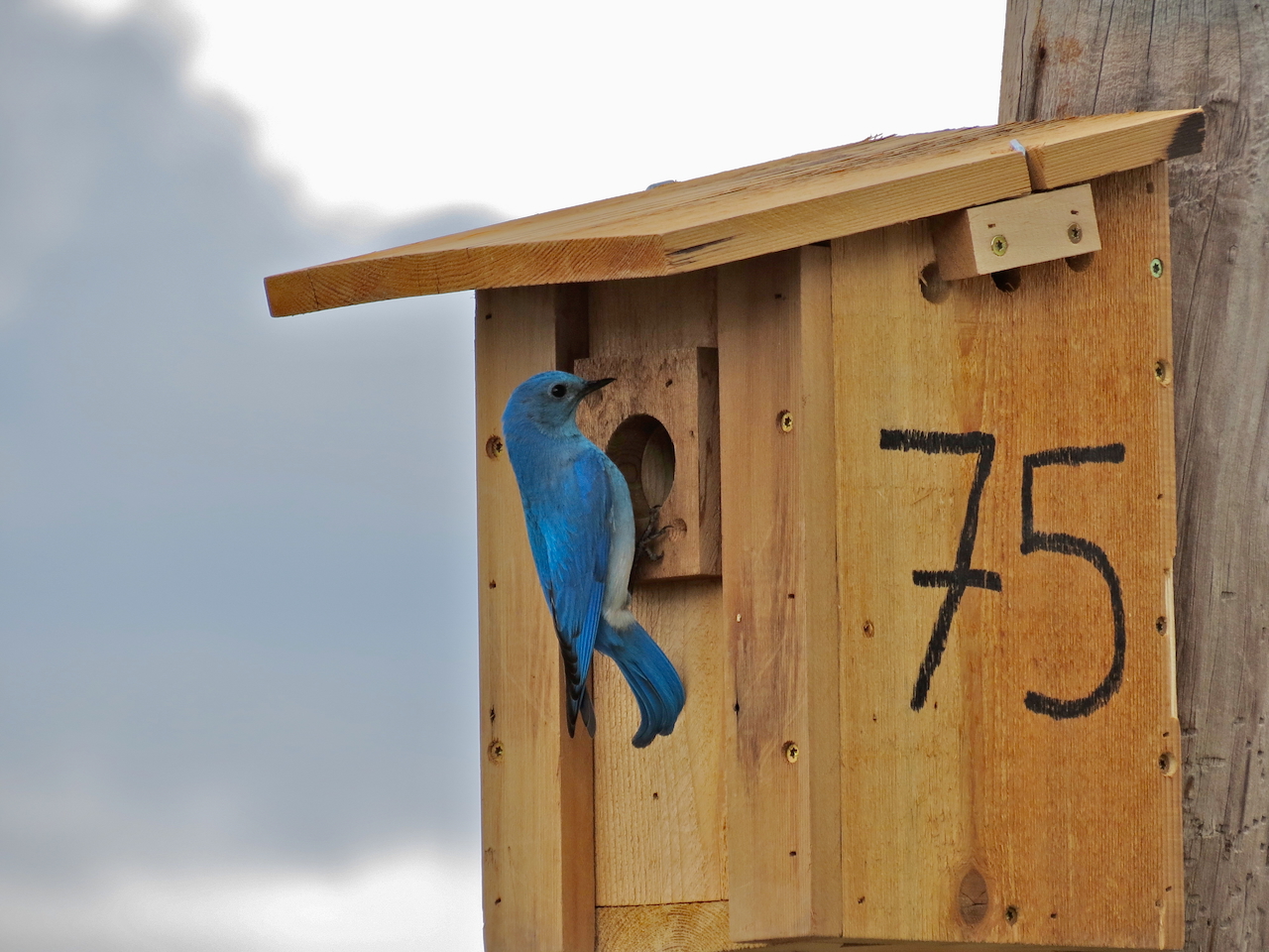 The 54th year of the Bluebird Trail Project concluded with below average numbers of Mountain Bluebirds. A total of 467 bluebirds fledged from our five trails, compared to 587 last year. The two interesting observations of the season were a European Starling nesting in Box #1 on Dry Creek Rd., and a Violet-green Swallow successfully nesting in Box #75 on Rocky Mtn. Road. We have always assumed starlings were too big to enter through a 1-9/16” hole, but apparently not! There was also a flash flood this spring on Dry Creek Rd in April which washed away a section of fence and one of the nest boxes. Luckily the box was recovered and relocated across the road.